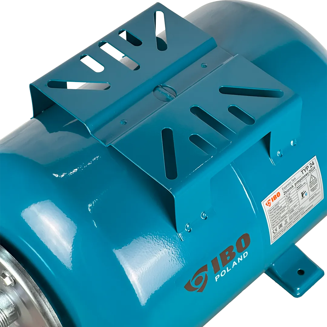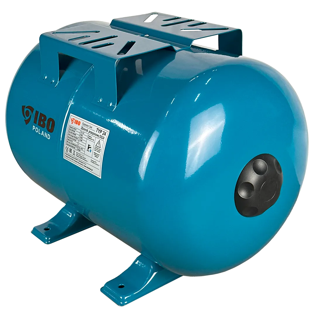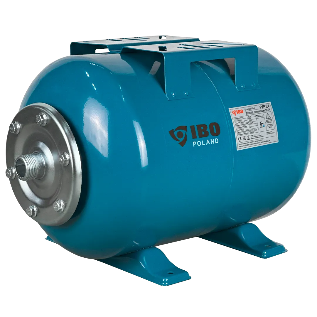 Горизонтальный мембранный бак для воды IBO объемом 24 литра. Бак выполнен из стали и покрыт специальным антикоррозионным составом. Мембрана бака выполнена из пищевой резины на основе бутилкаучука. Бак снабжен приварной площадкой для установки поверхностного насоса. В нижней части бака установлены металлические кронштейны с целью крепления бака к поверхности.