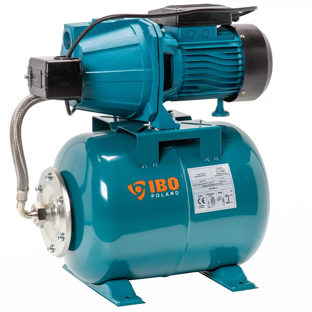 Одноступенчатая, самовсасывающая, насосная станция от Польского производителя IBO JET 100A TF 24л, оснащенный системой, увеличивающей мощность всасывания благодаря использованию трубки Вентури, предназначен для перекачивания чистой, холодной воды из собственных водозаборов и повышения давления. Максимальный забор воды до 8 метров, максимальный напор гидрофора 50 м, максимальна производительность 3.6 м³/час. При этом насосная станция обладает сравнительно не большой мощностью 1100 Вт. На насосной части установлена система автоматики на базе реле давления, защита от работы без воды в насосе нет. Насос установлен на баке объемом 24 л, которы предохраняет насос частых включений / отключений и компенсирует гидроудар в системе водоснабжения. Корпус насоса изготовлен из прочного чугуна, а двигатель оснащен тепловой защитой. Насос имеет шнур питания с вилкой 0.5 м. Насос также доступен с аксессуарами или в гидрофорном комплекте.