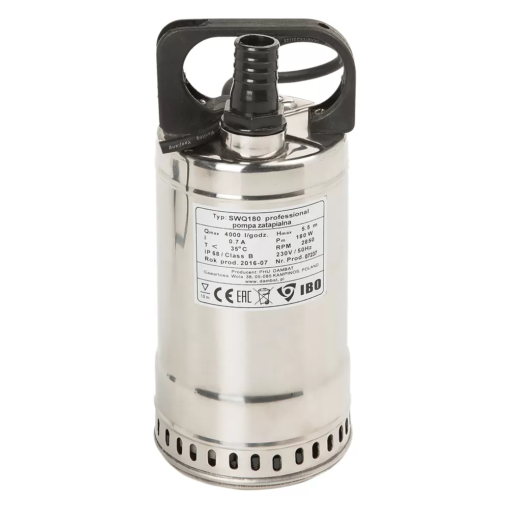 Погружной насос из нержавеющей стали. Предназначен для откачивания чистой и слегка загрязненной воды. Благодаря использованию высококачественной нержавеющей стали удалось добиться безаварийной работы насоса в течение долгих лет. Двигатель насоса охлаждается за счёт перекачиваемой жидкости, вследствие чего насос может использоваться в полупогруженном положении. Насос SWQ 180, благодаря своему диаметру в 120 мм, может использоваться в узких приямках.