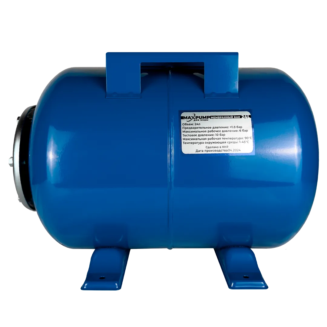 Гидроаккумулятор для воды MAXPUMP H-24 горизонтального исполнения предназначен для систем холодного водоснабжения. Гидроаккумулятор служит для накапливания запаса воды объемом до 24 литров, снижения вероятности возникновения гидравлических ударов в системе, а также сокращения количества пусков насоса, тем самым продлевая срок службы насоса. Конструкция гидроаккумулятора представляет собой стальной корпус, окрашенный в зеленый цвет, со сменной мембранной, изготовленной из высококачественного материала EPDM, опорными ножками у основания бака, воздушным клапаном и площадкой для установки насоса. Горизонтальные гидроаккумуляторы, благодаря установочной площадке, расположенной на поверхности бака, могут использоваться с поверхностными насосами.
