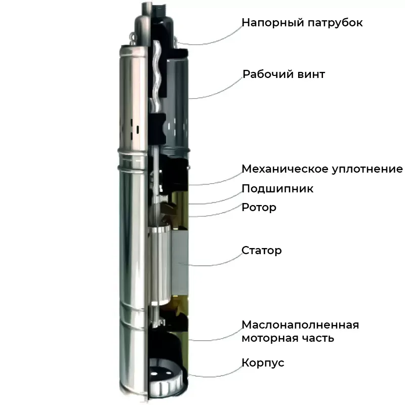 - Электродвигатель: однофазный с масляным охлаждением