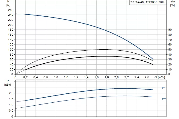Насос Grundfos SP 2A-40 создан с применением новейших гидравлических технологий. Grundfos SP 2A-40 созданные специально для того, чтобы обеспечивать максимальную эффективность в периоды высокой нагрузки, насос имеет низкую стоимость и высокую надёжность эксплуатации вне зависимости от вида назначения. Grundfos SP 2A-40 обеспечивает высокую эффективность, высокое сопротивление абразивному износу (песку и иным абразивам), защиту от перегрева двигателя и простоту технического обслуживания. Также доступна готовая к применению система контроля и управления, предназначенная для постоянной оптимизации работы насосной системы. Максимальная производительность насоса 2.5 м3/час, максимальный напор 245 м при мощности электродвигателя 2200 Вт. Насос работает от сети 220 в. Гарантийный срок на насос Grundfos SP 2A-40 составляет 2 года.