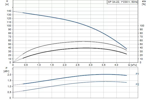 Насос Grundfos SP 3A-22 создан с применением новейших гидравлических технологий. Grundfos SP 3A-22 созданные специально для того, чтобы обеспечивать максимальную эффективность в периоды высокой нагрузки, насос имеет низкую стоимость и высокую надёжность эксплуатации вне зависимости от вида назначения. Grundfos SP 3A-22 обеспечивает высокую эффективность, высокое сопротивление абразивному износу (песку и иным абразивам), защиту от перегрева двигателя и простоту технического обслуживания. Также доступна готовая к применению система контроля и управления, предназначенная для постоянной оптимизации работы насосной системы. Максимальная производительность насоса 4.3 м3/час, максимальный напор 120 м при мощности электродвигателя 1500 Вт. Насос работает от сети 220 в. Гарантийный срок на насос Grundfos SP 3A-22 составляет 2 года.
