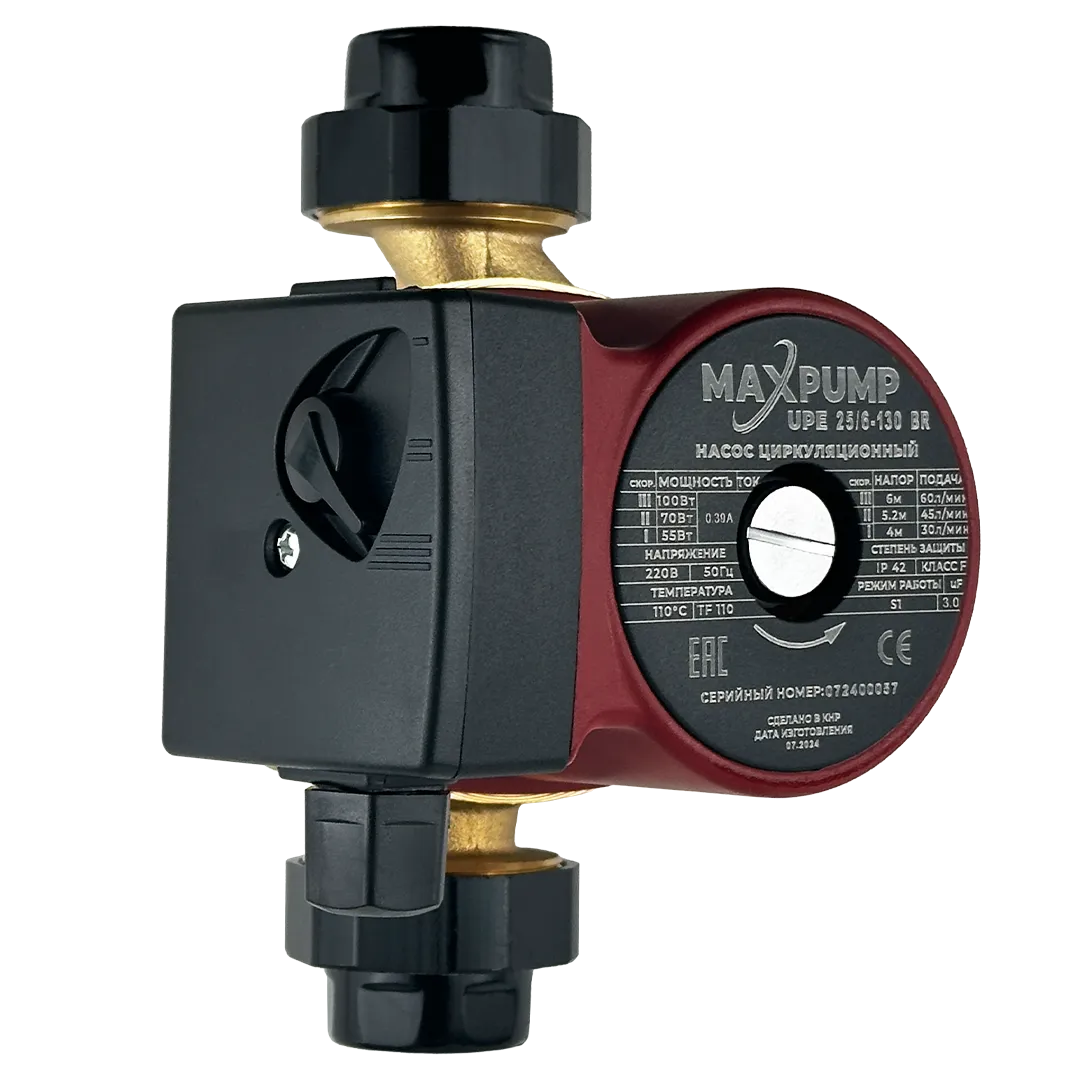 MAXPUMP UPE 25/6-130 BR предлагает три уровня мощности: 55 / 70 / 100Вт. Это позволяет вам адаптировать циркуляционный насос под ваши конкретные нужды, выбирая оптимальный режим работы. Высокая эффективность насоса обеспечивает максимальный напор до 6 метров и максимальный расход до 3.36 м³/ч. Такие показатели позволяют обеспечить надёжную циркуляцию воды в системах отопления и горячего водоснабжения, даже если у вас большая площадь.