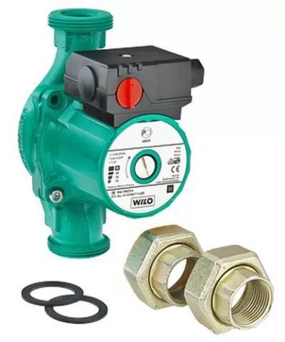 Циркуляционный насос WILO STAR-RSG 25/8 с мокрым ротором и резьбовым соединением. Возможен выбор ступеней частоты вращения для согласования мощности.